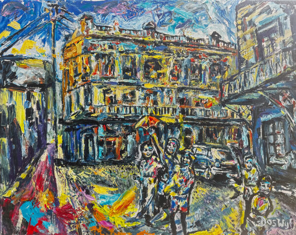 The artwork depicts an expressive, almost frenetic style to capture the exuberance and close-knit society that characterized District 6. The composition focuses on the daily life and communal interactions, with the absence of any indication of the impending destruction that would later come to pass, making it both a celebration of community and a silent protest against its loss.