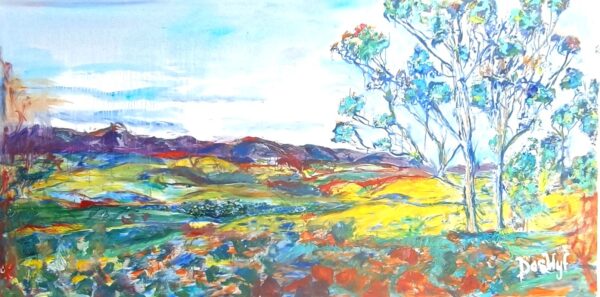 The “Eucalyptus Landscape” painting offers a serene yet invigorating scene of a eucalyptus grove overlooking a canola landscape. A marriage of natural colors and nuanced brushwork, this artwork is perfect for those looking to bring the tranquility and energy of the outdoors into their living or workspace. Experience the allure of nature with this exceptional landscape painting.