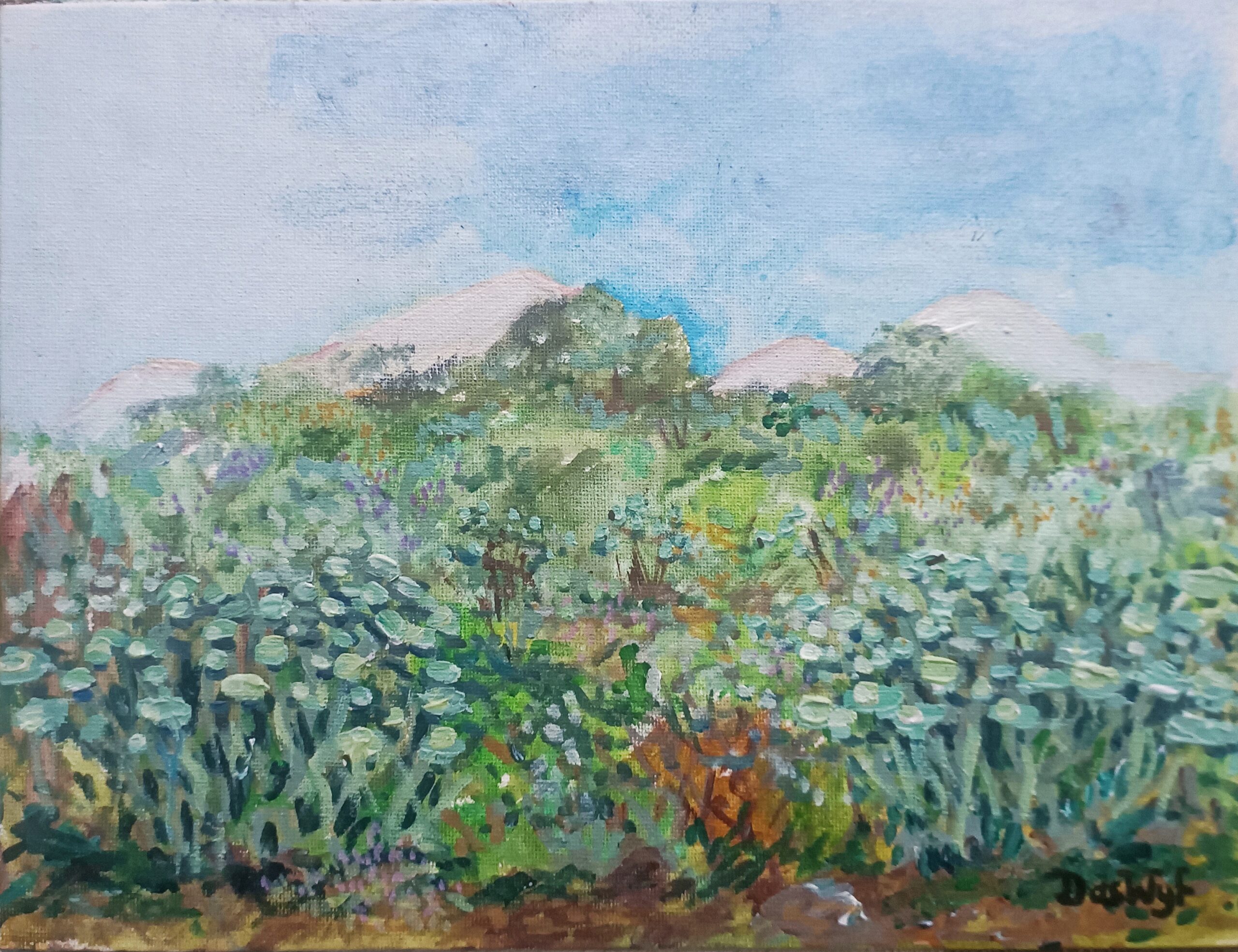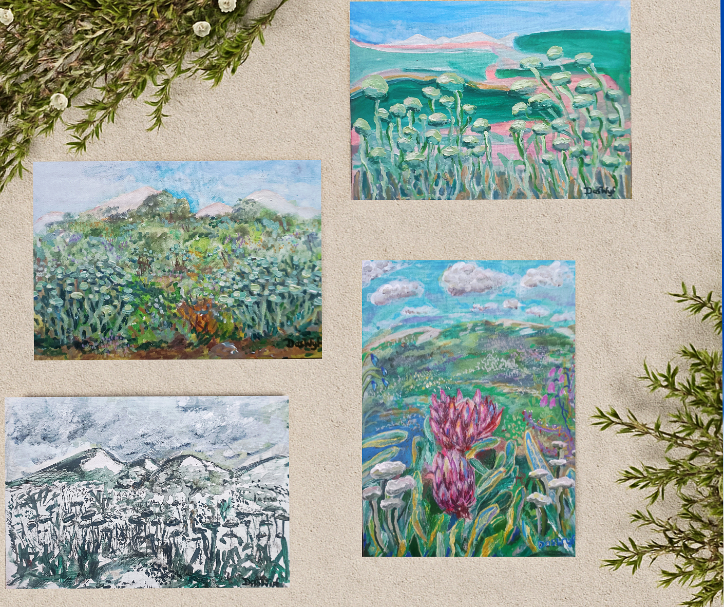 Fynbos Biodiversity – Inspired by the raw beauty of De hoop Nature reserve! One of 4 paintings in the Witsand collection. The sand really is a pure surreal white colour and the area just bursts with biodiversity. The 4 paintings of this collection were created around a campfire in the nature reserve. An overhead camp-lantern, the light of the fire and the night sky illuminated these paintings – and I do feel that the wonder and beauty of the area and that particular moment were captured in this collection.