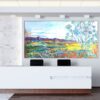 Energetic strokes and splashes of paint create a sense of motion and vitality. The cool blues in the lower section contrast with the orange and yellow hues, highlighting the figures. The work captures a communal spirit of joy and togetherness.