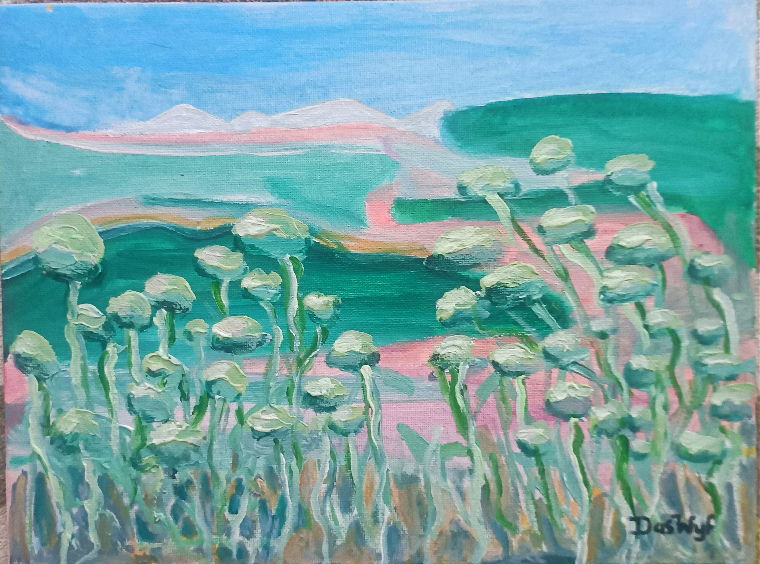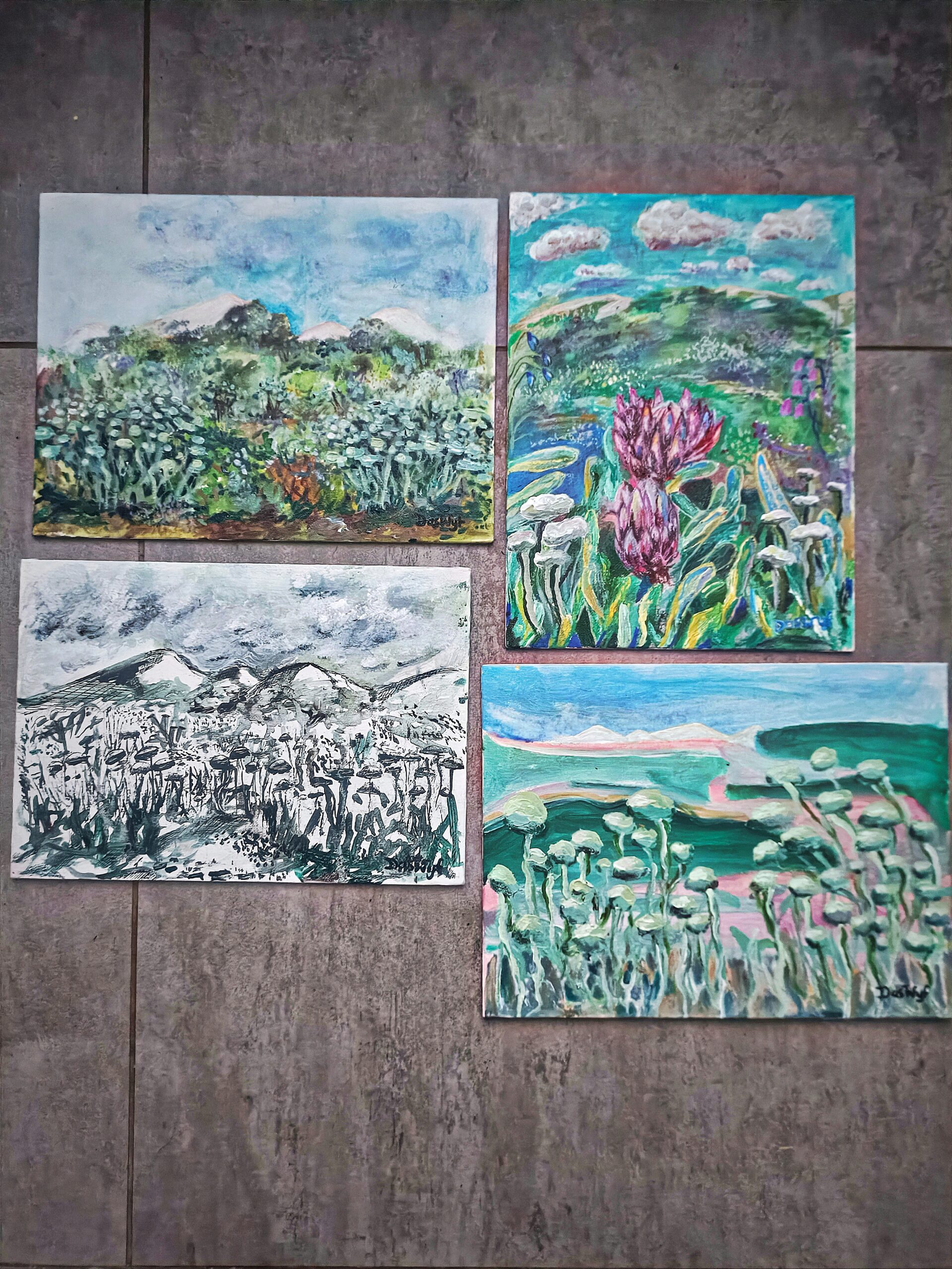 Inspired by the raw beauty of De hoop Nature reserve! One of 4 paintings in the Witsand collection. The sand really is a pure surreal white colour and the area just bursts with biodiversity. The 4 paintings of this collection were created around a campfire in the nature reserve. An overhead camp-lantern, the light of the fire and the night sky illuminated these paintings – and I do feel that the wonder and beauty of the area and that particular moment were captured in this collection.