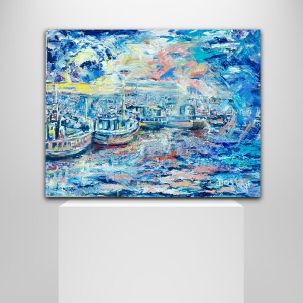 As the crisp morning air fill your lungs and the sunlight touches the water, there is a sense of calm, accompanied by excitement. This oil painting with tones of peach, contrasting with the cool blues, is a wonderful addition to your collection.