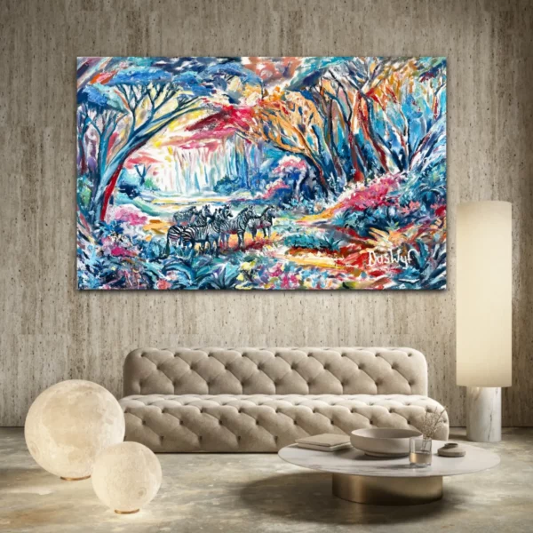 Zebra Vibrant – It is time for vibrant colours to light up a room and the mood. These modern colours are trending in the interior decorating art scene. It is bold, bright, and big! Dominating blue’s and forest green’s sets a calm and relaxing tone. If you love Zebra, this wildlife painting is just for you. The value of Daswyf artwork’s annual growth rate is increasing, which makes it an excellent investment for collectors. Don’t miss out on this one-of a kind oil painting!